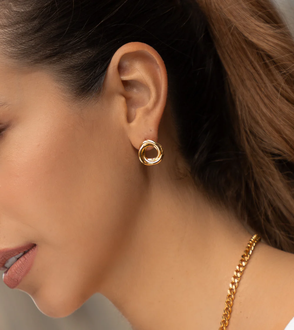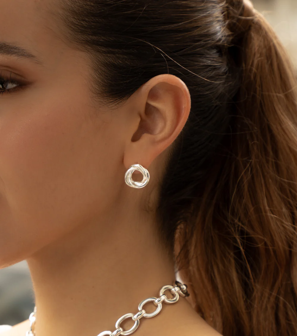Elegantes pendientes de plata con un diseño circular entrelazado, perfectos para añadir un toque moderno y sofisticado a tu estilo diario o para ocasiones especiales.