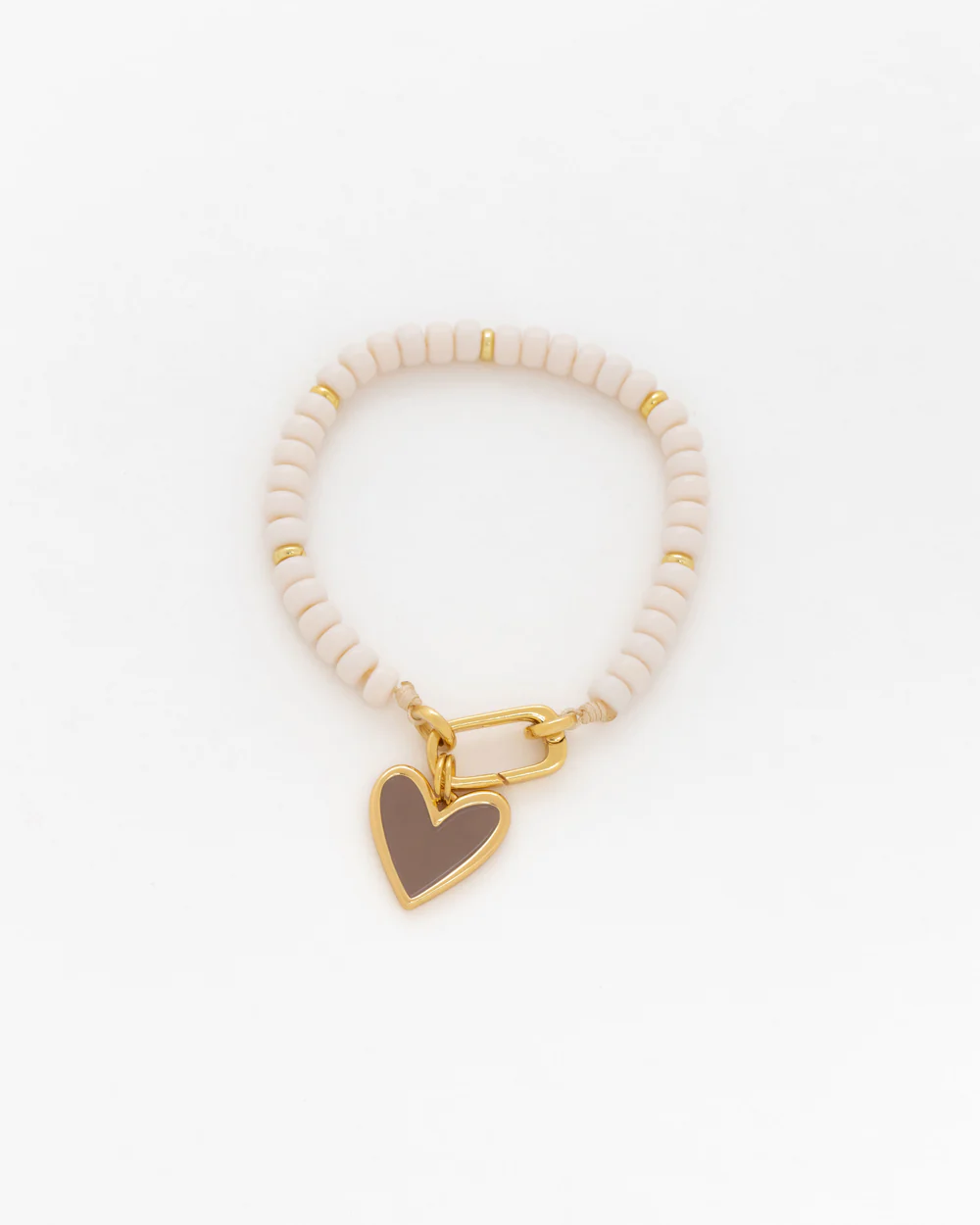Elegante pulsera de cuentas blancas con un dije de corazón esmaltado en tono taupe y un moderno cierre tipo mosquetón dorado, perfecta para añadir un toque delicado y romántico a cualquier atuendo.