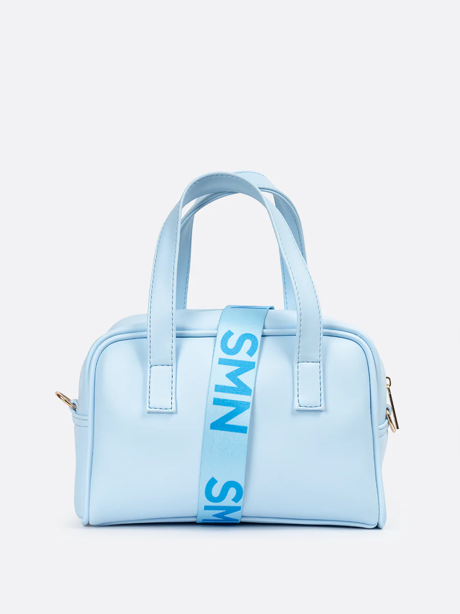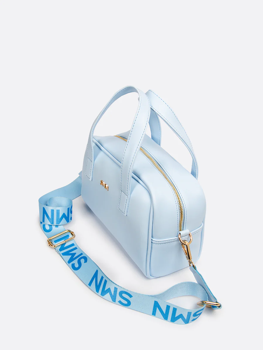 Bolso estilo bowling en un suave tono azul cielo, ideal para un toque fresco y chic. Incluye asa de mano y correa ajustable para llevar al hombro.