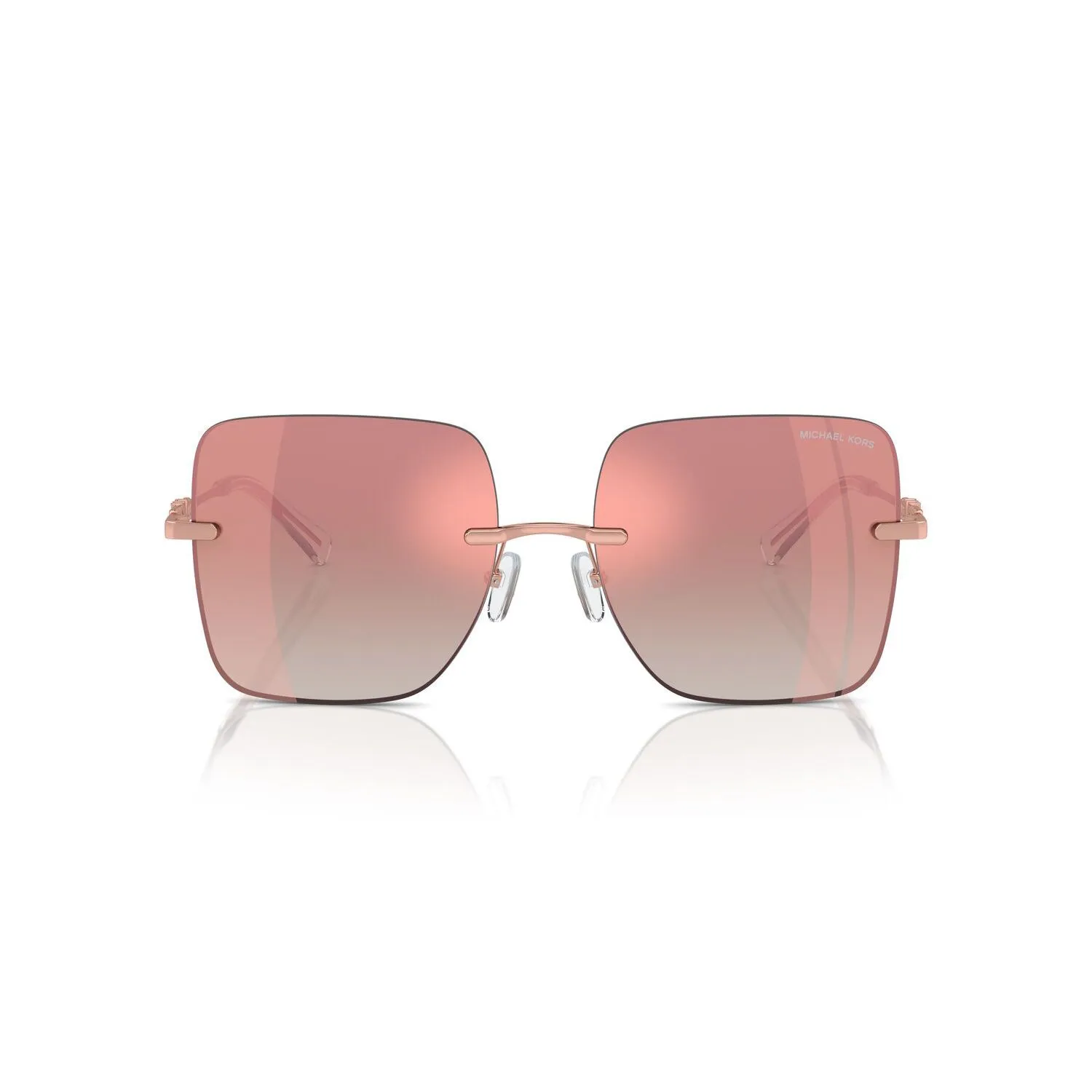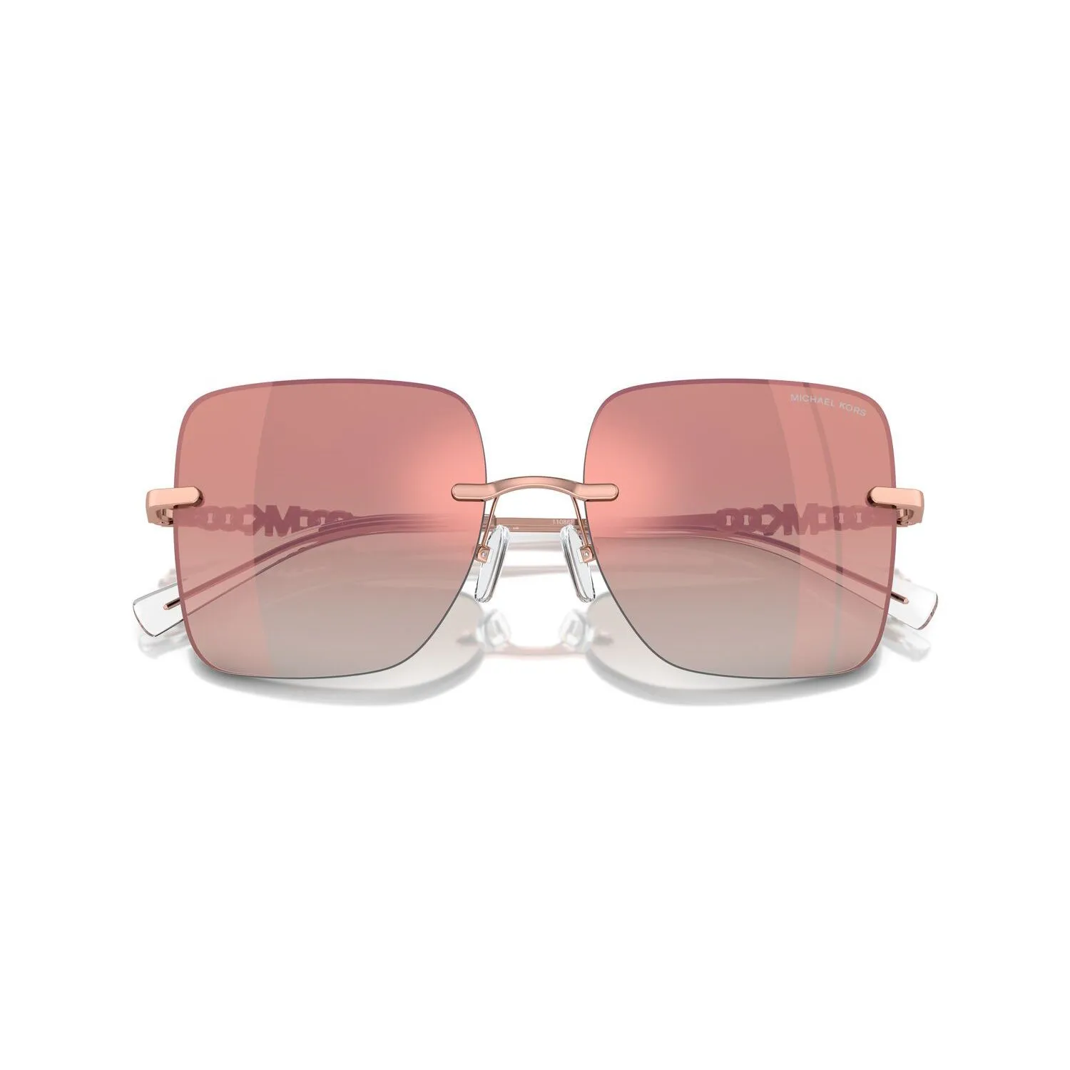 Eleva tu estilo con estas gafas de sol Michael Kors sin montura, un accesorio chic y moderno. Cuentan con lentes cuadradas de espejo en tono oro rosa y patillas con diseño trenzado. Perfectas para un look sofisticado y contemporáneo.