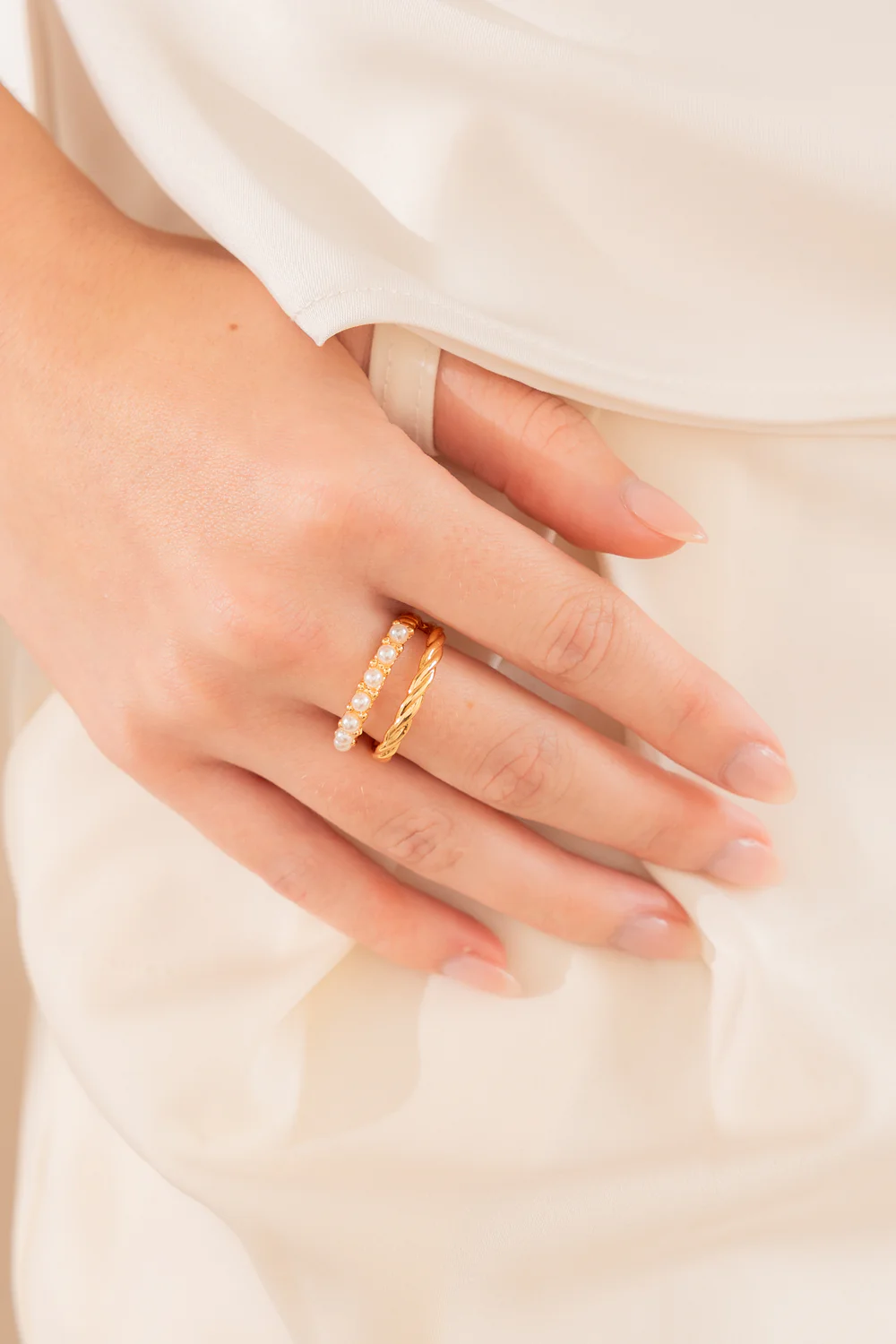 Elegante set de dos anillos dorados: uno con delicadas perlas y otro con un diseño trenzado. Perfectos para lucir juntos o por separado, añadiendo un toque de sofisticación a cualquier look.