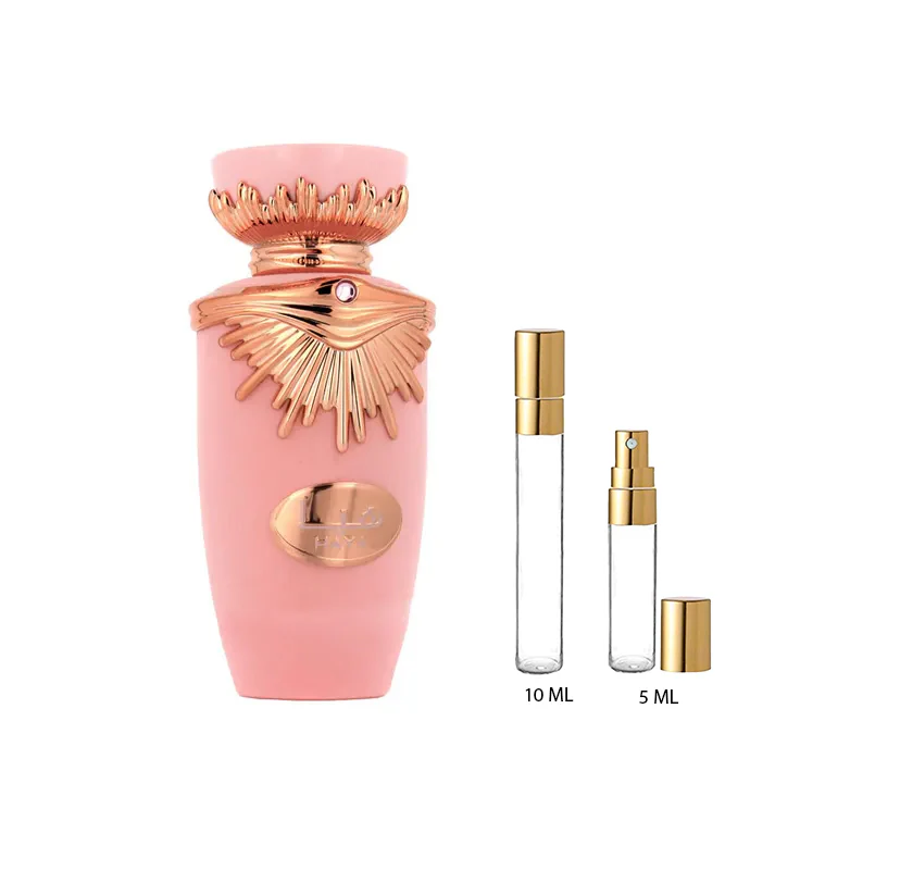 Perfume Haya en una elegante botella rosa con detalles dorados ornamentados, perfecto para mujeres que buscan una fragancia distintiva y sofisticada. Su diseño evoca lujo y feminidad.