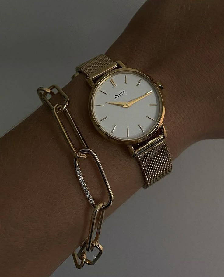 Elegante reloj Cluse con un diseño minimalista, caja dorada y esfera blanca pura. Complementado con una sofisticada correa de malla milanesa en tono dorado que lo hace perfecto para cualquier ocasión.