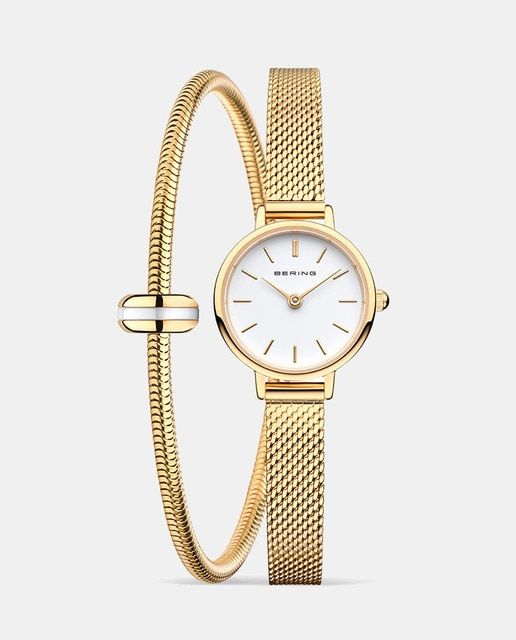 Elegante set de regalo Bering que incluye un reloj minimalista con correa de malla milanesa dorada y una pulsera a juego. Perfecto para un toque de sofisticación y estilo atemporal.