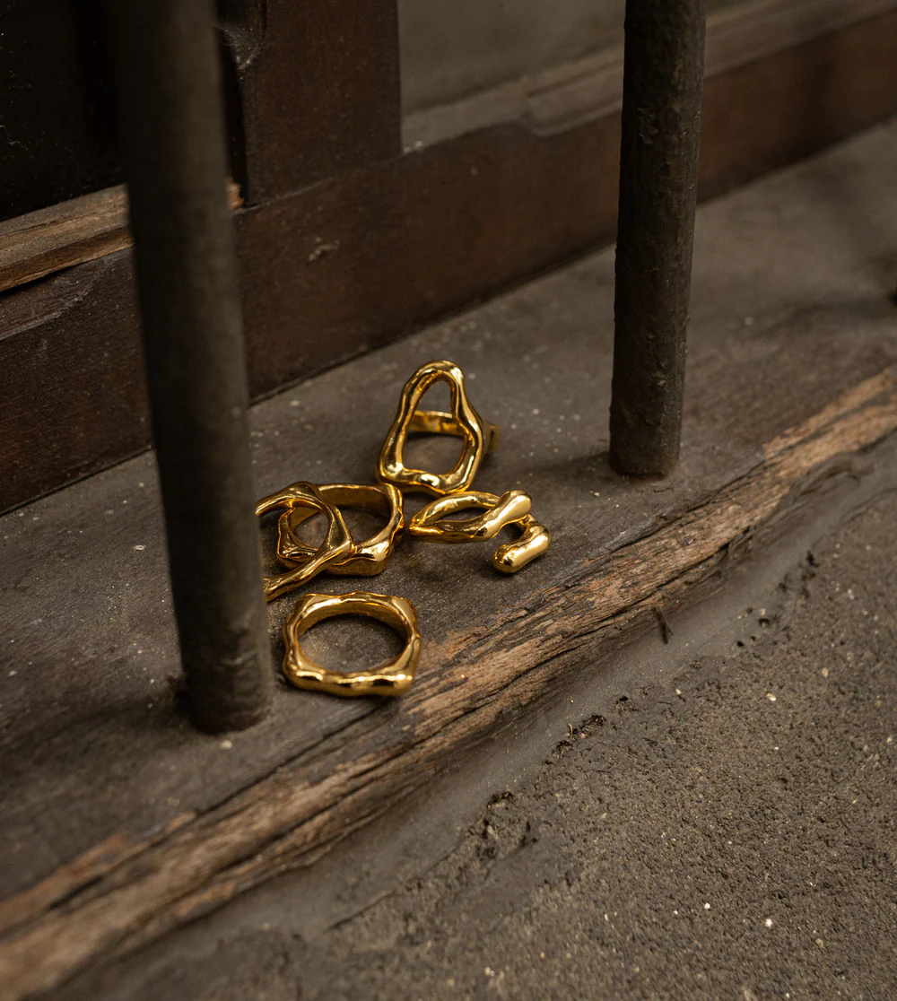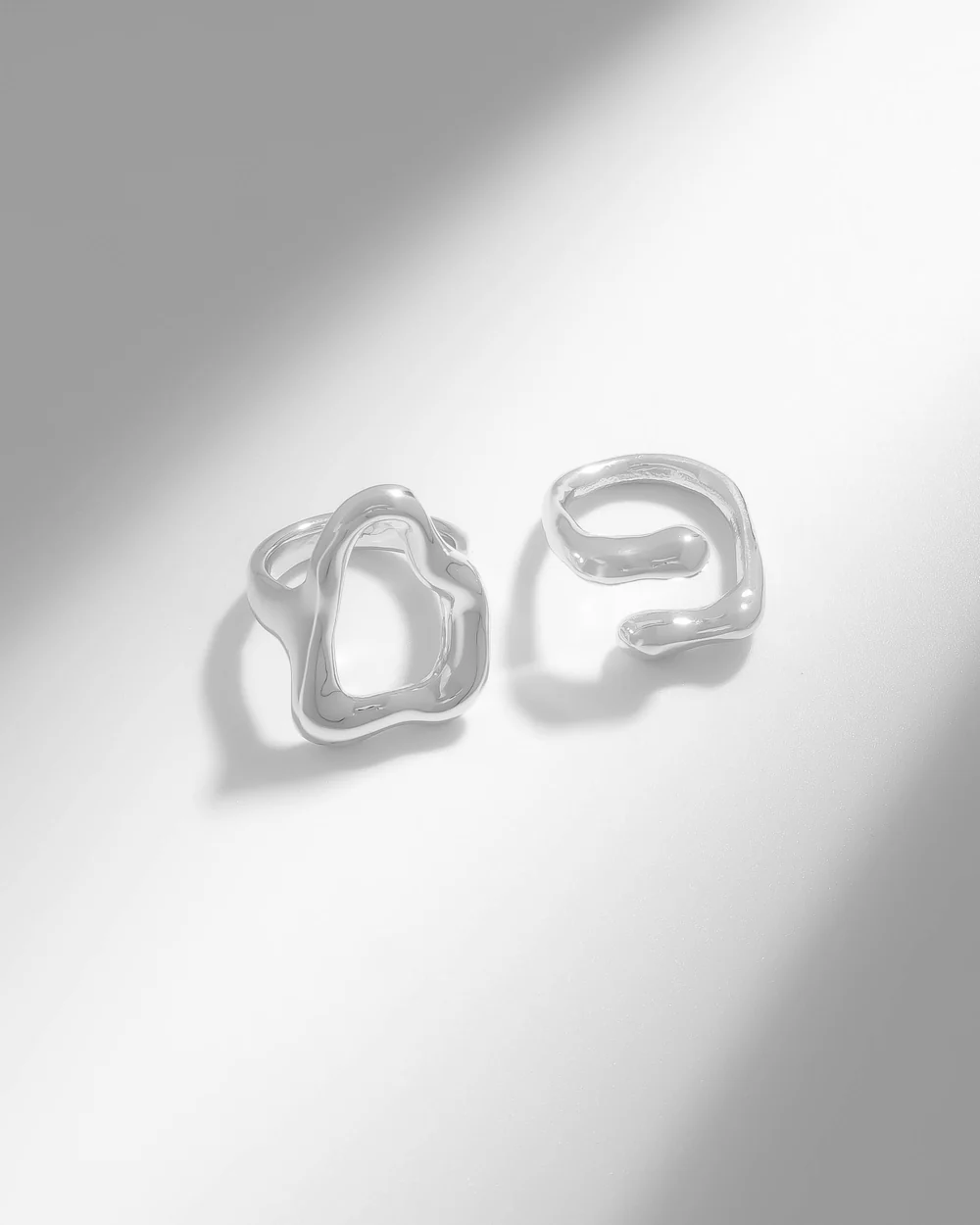 Captura la esencia moderna con nuestro conjunto de anillos y brazalete de diseño orgánico. Piezas únicas en tono plateado que añaden un toque artístico y contemporáneo a cualquier atuendo, perfectas para expresar tu estilo.