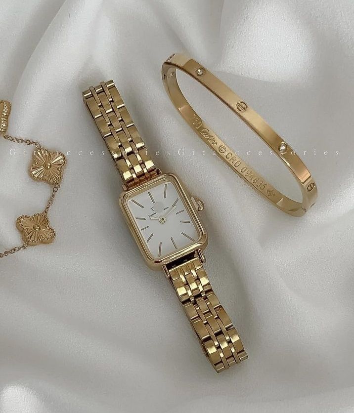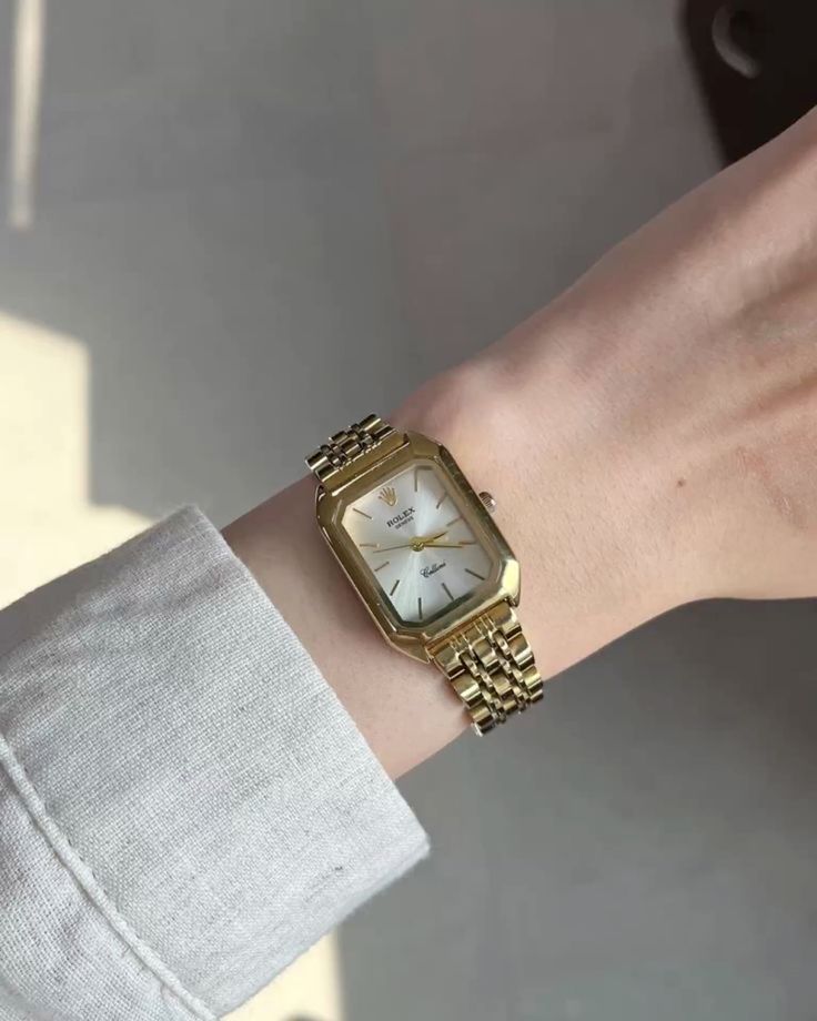 Elegante reloj Rolex Cellini de oro con distintiva caja rectangular y pulsera de eslabones, ideal para añadir un toque de sofisticación clásica a cualquier atuendo.