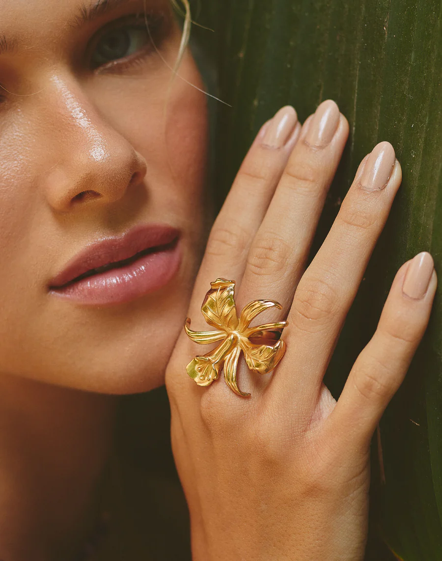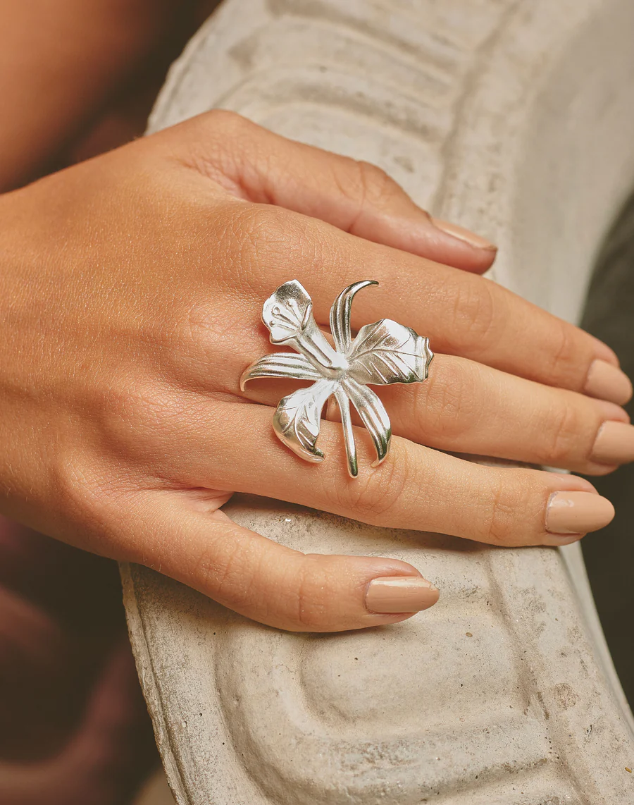 Anillo de plata con un diseño exquisito en forma de orquídea, capturando la belleza natural con un acabado brillante. Una pieza elegante y moderna para realzar cualquier look.
